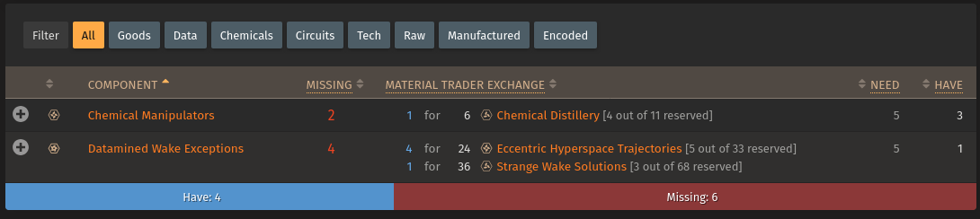 This page summarizes all your missing materials and what other materials you can exchange them with. Inara takes care not to offer exchanges with materials you need. You can also see the number of materials you need (MISSING or NEEDING) and the number you have (A). Finally, the small "+" on the left reveals a list of possible exchanges.