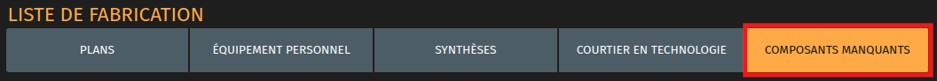 Once you’ve added all your plans, your list will be complete. But more plans means more missing materials. Click on « MISSING COMPONENTS » for a summary, but that’s not all…