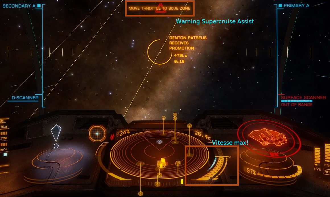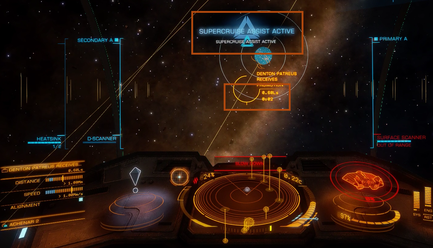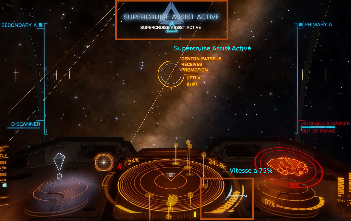 When you arrive at 0:07 seconds from your destination, go to 75% throttle to be in the blue zone. I advise you to have a button configured for this. When you're in the blue zone, supercruise assist is activated.